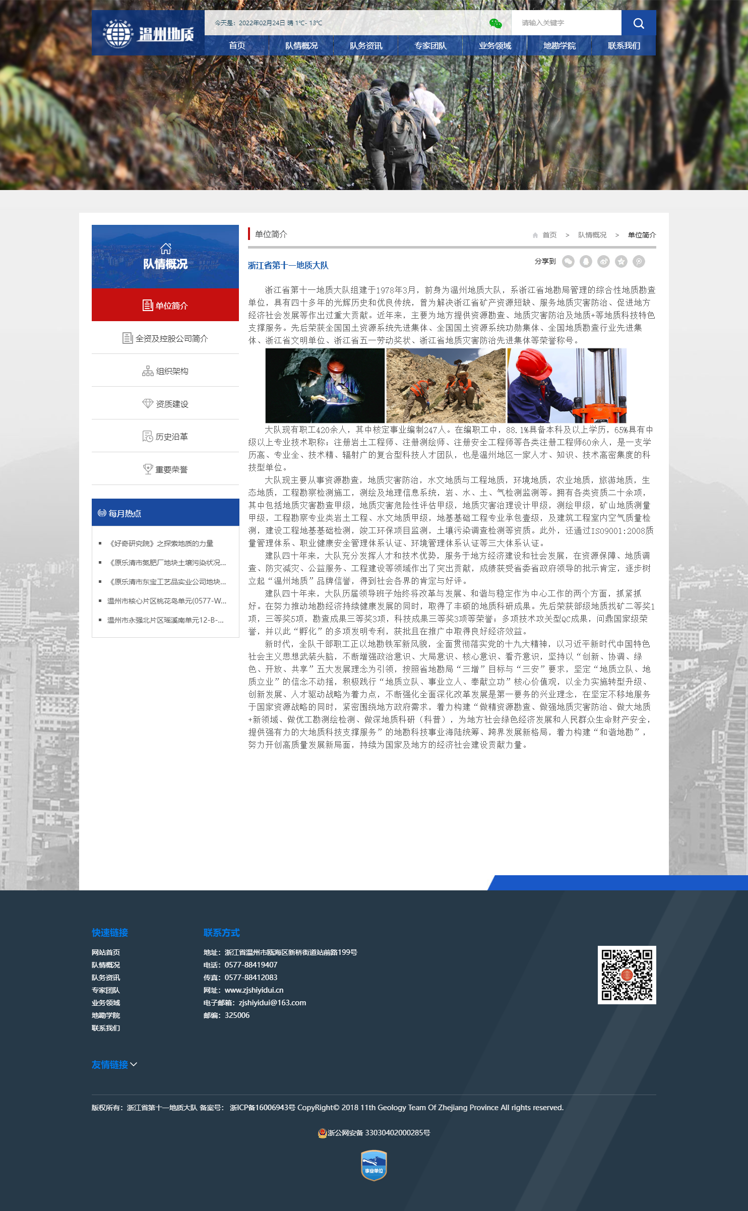 浙江省第十一地質(zhì)大隊(duì)組建于1978年3月,前身為溫州地質(zhì)大隊(duì),系浙江省地勘局管理的綜合性地質(zhì)勘查單位,具有四十多年的光輝歷史和優(yōu)良傳統(tǒng),曾為解決浙江省礦產(chǎn)資源短缺、服務(wù)地質(zhì)災(zāi)害防治、促進(jìn)地方經(jīng)濟(jì)社會(huì)發(fā)展等作出過(guò)重大貢獻(xiàn)。近年來(lái),主要為地方提供資源勘查、地質(zhì)災(zāi)害防治及地質(zhì)+等地質(zhì)科技特色支撐服務(wù)。先后榮獲全國(guó)國(guó)土資源系統(tǒng)先進(jìn)集體、全國(guó)國(guó)土資源系統(tǒng)功勛集體、全國(guó)地質(zhì)勘查行業(yè)先進(jìn)集體、浙江省文明單位、浙江省五一勞動(dòng)獎(jiǎng)狀、浙江省地質(zhì)災(zāi)害防治先進(jìn)集體等榮譽(yù)稱(chēng)號(hào)。